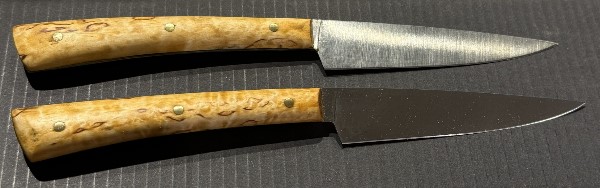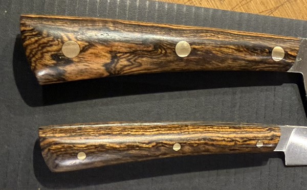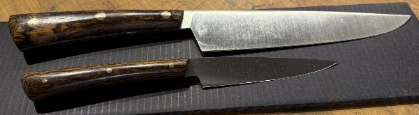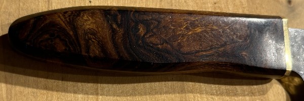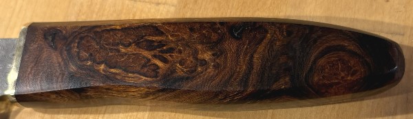Speziell dieses bereits fertige Messer hat einen Griff aus Bocote, dessen Maserung sehr stark an Wurzelholz erinnert. Der Preis für dieses Messer liegt in der großen Variante bei 249.- Euro; und in der kleinen Variente bei 149.- Euro. Sollten Sie beide Messeer gemeinsam erwerben freue ich mich in diesem Fall über einen Kaufpreis von 369.- Euro.